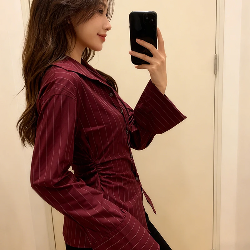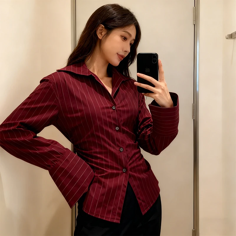 Make a statement without saying a word in this rich burgundy pinstripe blouse, designed for the woman who means business — stylishly. The luxe satin-finish fabric catches the light beautifully, giving it an elevated look that reads polished at the office and effortlessly chic for an evening out. A tailored V-notch collar frames the neckline with understated sophistication, while the button-down front keeps things classic.